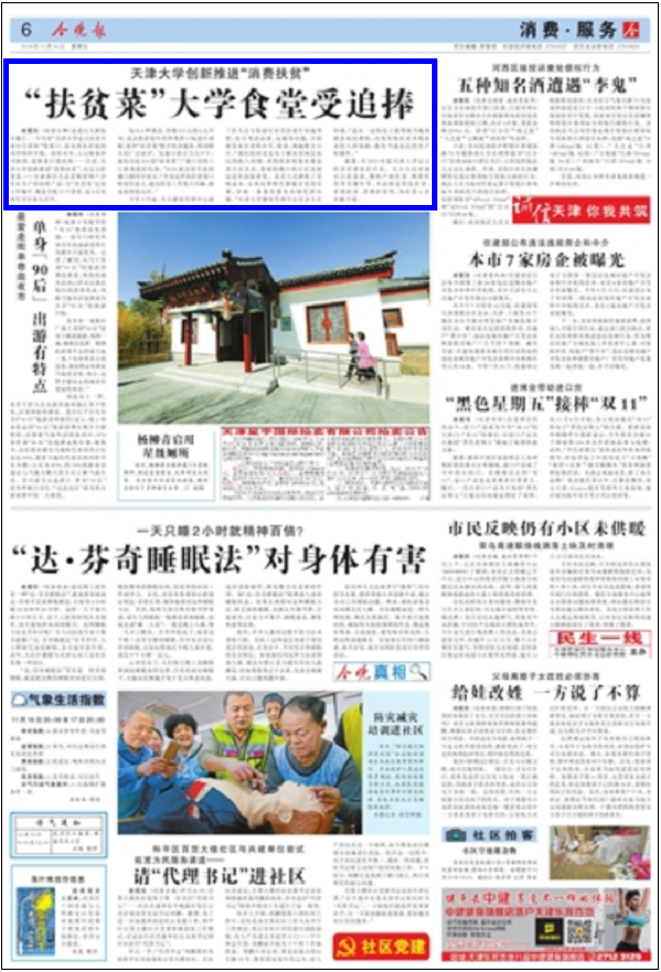 本报讯 (记者江珊 通讯员 赵习钧 焦全颖)走进天大新校区餐厅,一个写有“天津大学定点扶贫甘肃宕昌食材”的窗口,前来排队打饭的同学络绎不绝。清炒木耳、土豆粉条炒回锅肉、宽粉条白菜炖肉……日前,天津大学创新推进“消费扶贫”,从定点扶贫县——甘肃省宕昌县采购贫困户合作社生产的农特产品,让“扶贫菜”走进大学餐厅,覆盖全校11个食堂,近4万名师生可以参与其中。