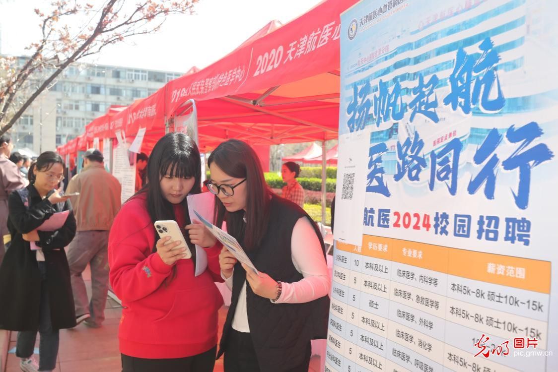 3月31日,天津医科大学在学校举办“春风送暖职引未来”2024届毕业生春季专场招聘会,图为大学生们在现场咨询。(沈岳摄/光明图片)