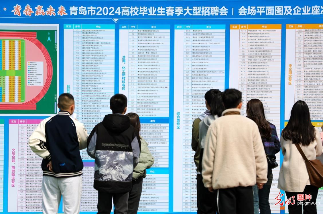2024年3月23日,在位于山东青岛西海岸新区的中国石油大学(华东)招聘会现场,高校毕业生在查看招聘企业信息。(张进刚摄/光明图片)