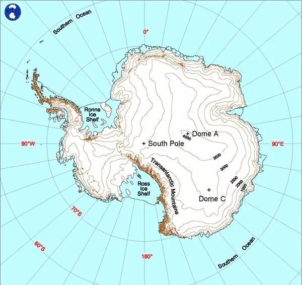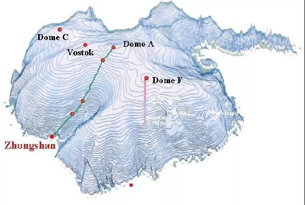 冰穹A(Dome A)的位置和从中山站到冰穹A的路线