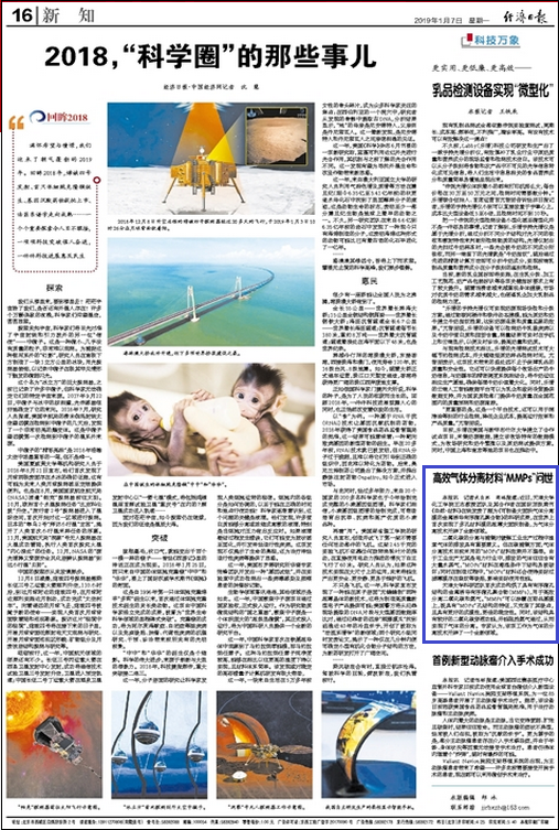 天津大学科研团队首次成功构筑了具有有序微孔结构的金属诱导有序微孔聚合物(MMPs),用于高效分离二氧化碳和氮气。“MMPs”可以涂覆在商品基膜上,既具有“MOFs”孔结构的特征,又克服了其缺点,且具有更好的成膜性,更佳的稳定性。同时,该结构具有较好的二氧化碳穿透功能,并能阻挡氮气通过,从而实现了气体的分离。专家认为,该项工作为气体的分离技术开辟了一个全新领域。