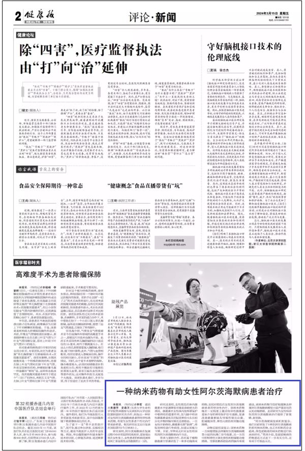 本报讯(特约记者 李哲 通讯员 焦德芳 史森方)天津大学生命科学学院常津教授与天津医科大学总医院窦妍副研究员合作,研发出一种针对女性阿尔茨海默病患者的特异性纳米药物,有望为女性患者个性化治疗带来新希望。相关研究论文近日发表在国际期刊《今日纳米》上。