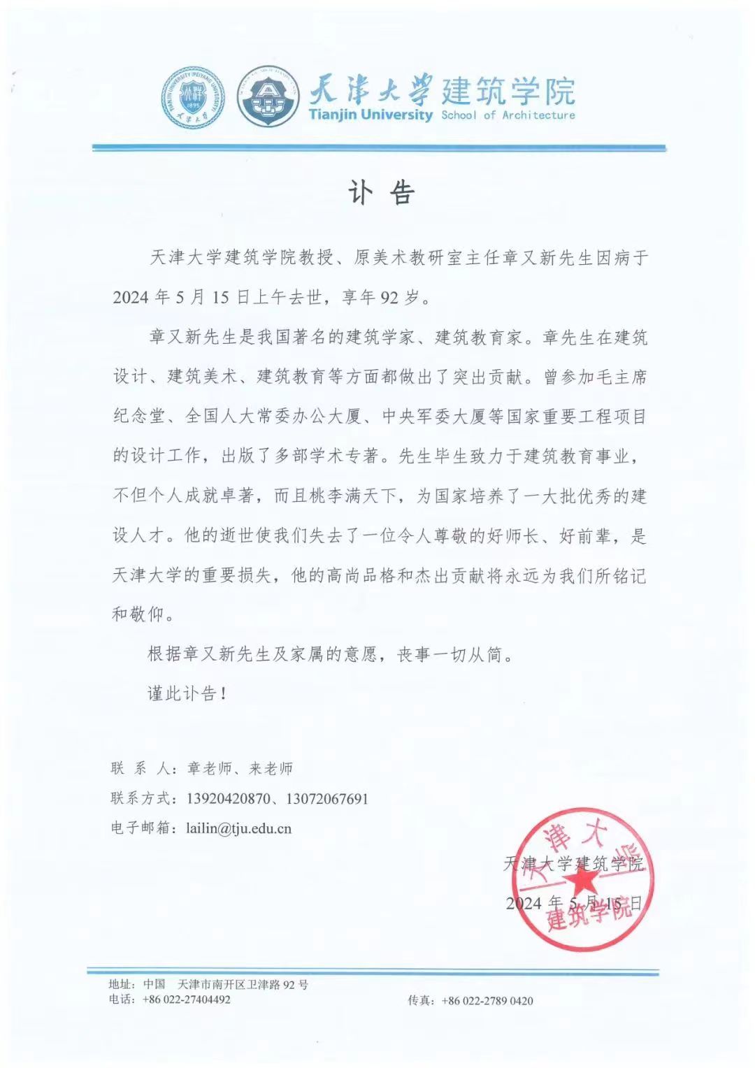 本站讯 昨晚(5月15日),天津大学建筑学院发布讣告称,天津大学建筑学院教授、原美术教研室主任章又新先生因病于2024年5月15日上午去世,享年92岁。