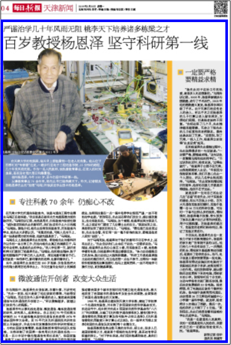 如今,杨恩泽先生虽然已经100岁高龄,但他依然把大部分的精力都用在培养学生上,不仅注重专业知识上的解惑授业,也特别注意在一点一滴中培养学生规范严谨、一丝不苟的治学态度。“直到现在,先生还在帮我们改论文,提出修改意见,优化实验系统。”马闯说,这个寒假,杨恩泽回南方探亲几天,去之前还专门要走了几位博士生的论文。“探亲回来之后,果然带回来了修改好的论文。”马闯说。“哪怕是已经发表过的,先生也会看,有任何一丝一毫不标准的地方,都难逃他老人家的‘法眼’。”