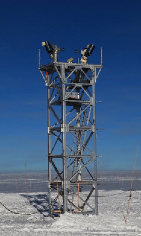 在国家自然科学基金委的支持下,国家天文台南极天文研究团组开展了冰穹A光学天文的台址测量工作,研制了昆仑视宁度测量望远镜KL-DIMM,在国内经过大量低温和野外测试后,两台望远镜由我国第35次南极科考队于2019年1月安装在昆仑站,架设在为其定制的8米高的塔架上(见图2)。自安装调试结束后,KL-DIMM即开始自动观测,已经获取了大量白天视宁度测量数据。结果表明,即使在白天,也有很多时间可以获得优异的自由大气视宁度。