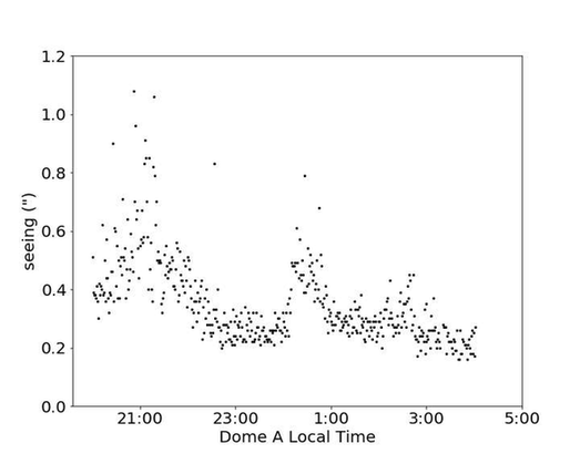 视宁度表征大气湍流造成望远镜成像抖动的模糊程度,是光学红外天文观测台址最重要的参数之一。视宁度数值越小,成像的角分辨率越高,望远镜对暗弱天体的探测能力就越强。因此地面大型望远镜的建设需要选择优良的台址。目前,世界上最好的台址集中在夏威夷和智利,其平均大气视宁度在0.6角秒左右。大气湍流主要集中在近地面的边界层,之上的自由大气湍流就非常小。常规台址边界层厚度约数百米,而南极内陆冰盖由于其特殊的地理位置,大气边界层非常薄,将望远镜架设在边界层之上成为可能。我国在冰穹A已经开展的台址测量表明,其边界层全年中值只有约14米,是南极冰穹C的一半,但过去尚无对夜间视宁度的直接测量。