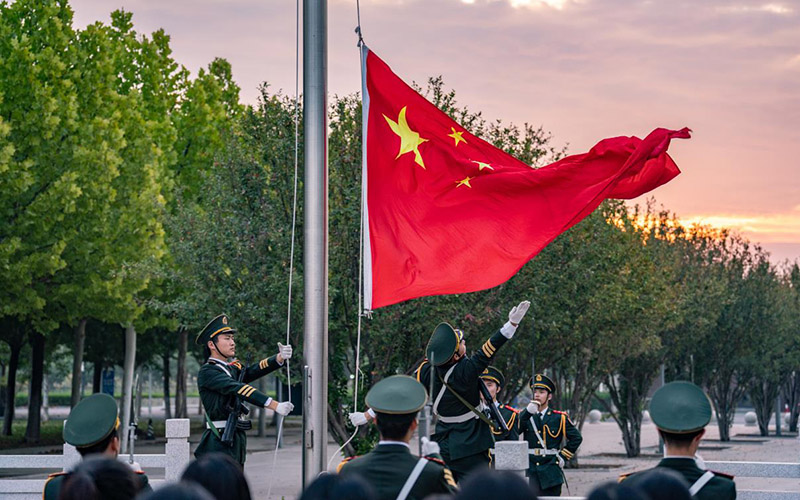 “十一正确的打开方式,当然要从早早起床看升旗开始!”10月1日清晨,天津大学在北洋园校区举行升旗仪式。国旗护卫队身姿挺拔、步伐整齐,披着朝阳护卫国旗徐徐走来。伴随着国歌响起,升旗手振臂一挥,鲜艳的五星红旗在数百名师生庄严的注目礼中缓缓上升。“从青涩懵懂到成熟自信,天津大学教会了我一个重要的词——家国情怀。”天津大学十佳杰出青年程启帆作为学生代表在国旗下发表演讲,表达天大学子对祖国的热爱与担当。“先辈夙愿在心,民族大任在肩!让我们接过中华民族伟大复兴的历史接力棒,在新征程上谱写新的辉煌!”。