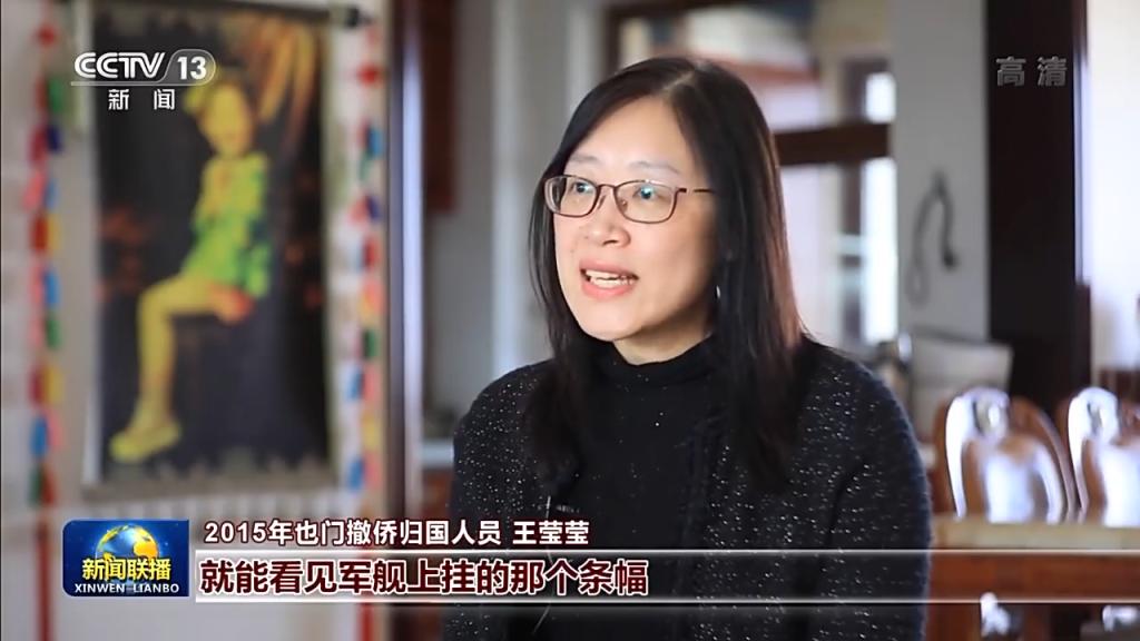 2015年也门撤侨归国人员 王莹莹:当船缓缓靠近的时候,就能看见军舰上挂的那个条幅,祖国派军舰接亲人们回家。当那个条幅缓缓靠近,我的心里是,眼眶是湿了。而且孩子也一直在喊,说妈妈你看到大船了吗?那是大船吗?还是觉得我们终于能回家了,就是有一种幸福感,这个幸福感从什么来,就是背后的强大的祖国,使我们觉得我们很安全。