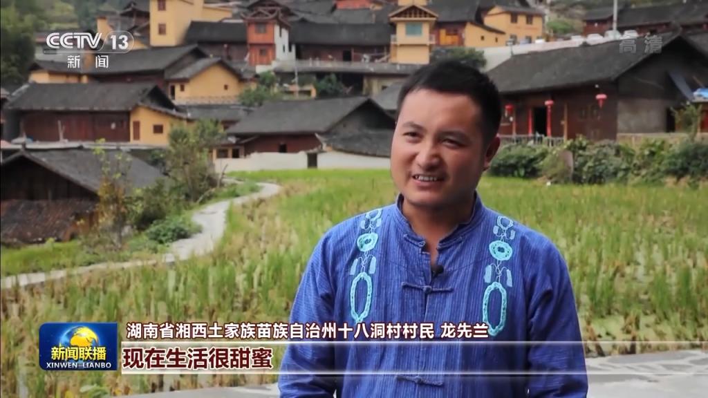 湖南省湘西土家族苗族自治州十八洞村村民 龙先兰:我自己是靠养蜜蜂、卖蜂蜜,脱贫又脱单,现在生活很甜蜜。没有党和国家就没有我们的现在,今天带着女儿把小国旗插起来,祝福我们的祖国繁荣昌盛。