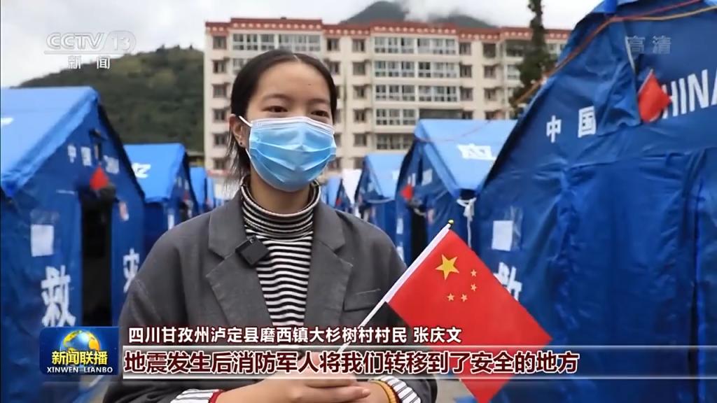 四川甘孜州泸定县磨西镇大杉树村村民 张庆文:我们一起歌唱祖国。地震发生后消防军人将我们转移到了安全的地方,当我们看到安置点内有帐篷,有吃的的时候,心里就很安心,党和国家没有放弃我们任何一个人,给了我们满满的安全感。