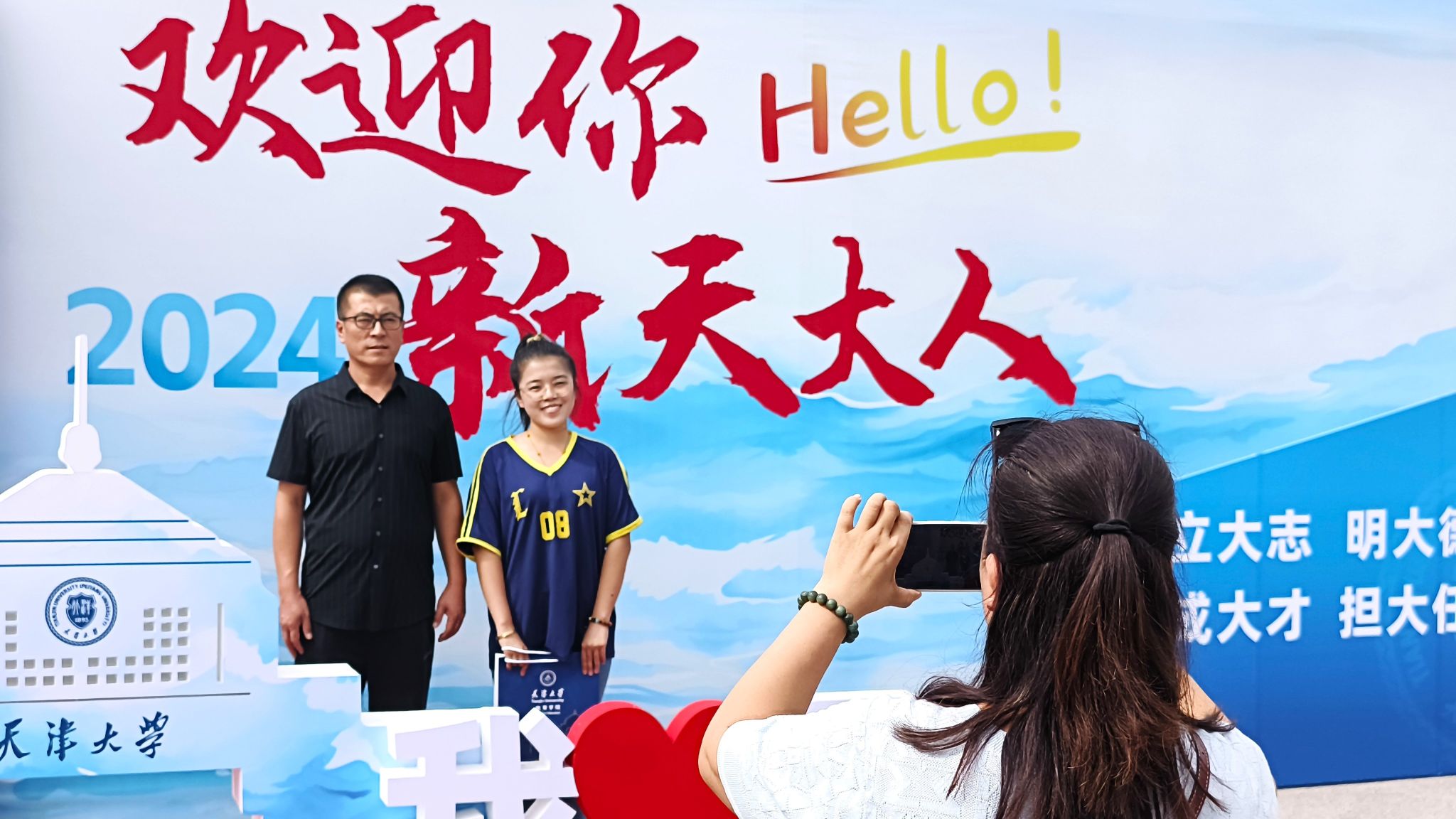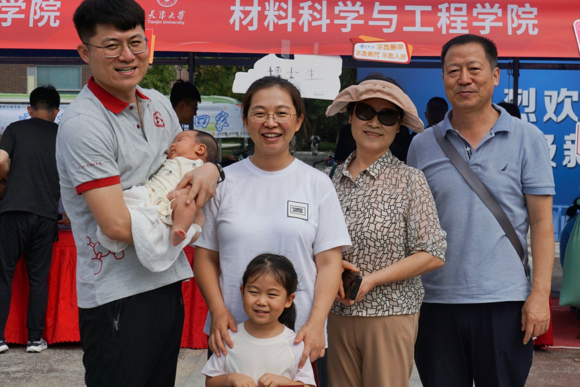 在材料学院迎新点,2024级工程博士付春雨带着父母妻子和两个女儿一起来报到,其中小女儿只有42天。完成报到手续后,现场的志愿者为这一家人拍下了幸福的全家福。1987年出生的付春雨已经37岁,在北京卫星环境工程研究所工作,为了提升自己他选择继续到天津大学继续攻读博士。