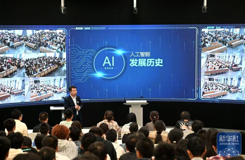 当日,天津大学《人工智能导论》正式开课。这是天津大学面向全体本科生推出的通识课程,约4000名学生在30余间智慧教室内同步听讲。