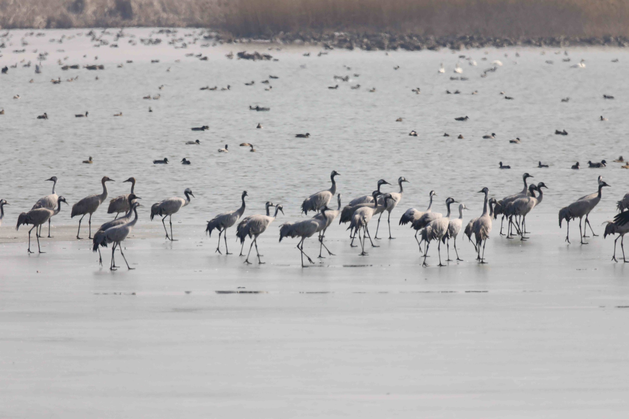 ♦ 国家级自然保护区诗意景观——灰鹤翩翩落苇滩,烟雨迷蒙中尤显仙姿。它们时而曲颈梳羽,银灰色毛羽在早春暖阳下流转珠光;时而展翼腾空,长翼展掠过芦苇荡,将《诗经》“鹤鸣于九皋,声闻于野”的意境化作现实画卷。