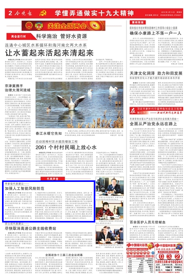 本报北京上午专电(特派记者 马庚申 雷风雨)出席十三届全国人大二次会议的全国人大代表、天津大学党委书记李家俊向大会提交建议,通过建立立法规范、健全政策支撑、升级改造全流程安全防控等举措,进一步加强人工智能风险防范。