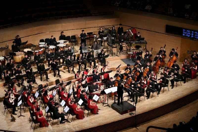 天津大学新年音乐会。天津大学供图上半场,北洋民族管弦乐团在常任指挥贾爱婷的指挥下,奏响中国锣鼓乐经典名曲《龙腾虎跃》,以音乐表现七个少数民族和谐相处的民族管弦乐组曲《七彩之和》(选段),描绘出一幅青山绿水画卷的《青青思念》等多首名曲,展现国乐之美。《射雕英雄传》主题曲《世间始终你好》燃爆全场,现场观众和乐团激情互动,尽显磅礴之气。音乐会下半场由北洋军乐团首席指挥李贝执棒,乐团带来了氛围热烈、旋律优美的管乐经典作品《王者之道:拉丁幻想曲》,表达人民对幸福向往和追求的《幸福的格物》,改编自经典民歌《在那遥远的地方》的管乐作品等中西方佳作。