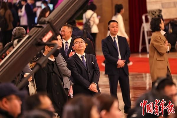 3月4日,北京人民大会堂,全国政协十四届三次会议首场“委员通道”集体采访活动上,全国政协委员、华中农业大学校长严建兵(中)等待走上通道。