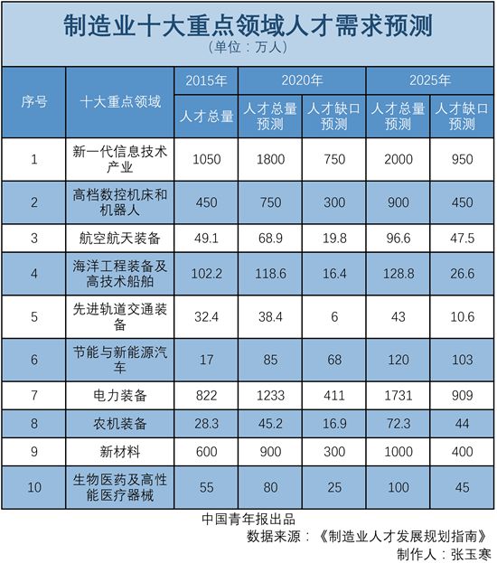 在《指南》中,最引人注目的要数其列出的“制造业十大重点领域人才需求预测”。在这份预测中,新一代信息技术产业、高档数控机床和机器人、航空航天装备、海洋工程装备及高技术船舶、先进轨道交通装备、节能与新能源汽车、电力装备、农机装备、新材料、生物医药及高性能医疗器械等10个专业榜上有名。