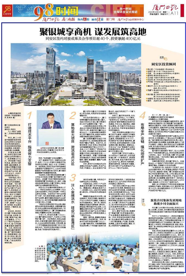 实际上,翻开同安版图,处处可见投资兴业的热土。“9·8”期间,“鼓浪屿论坛·世界商业领袖共话全球投资”调研考察活动走进环东浪漫线、环东云谷、银城智谷、美峰创谷等地,吸引国内外知名企业家、投资机构、专家学者亲身感受同安发展脉动。