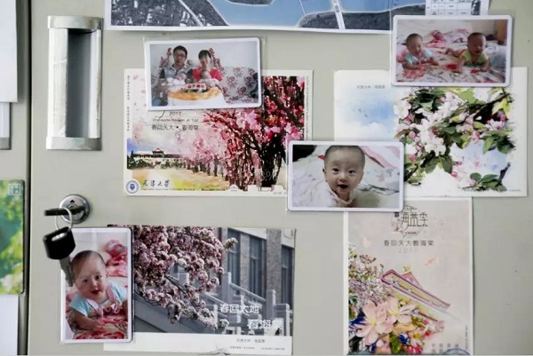 大寨村电商服务站的柜子上贴着好几张宋鹏爱人杨亚敬和孩子们的大头贴,杨亚敬发了朋友圈,宋鹏几乎每条都要点赞留言,但是真让他面对两个女儿的时候,他会显得有点手足无措,他不知道怎么带孩子,只能选择卖力气地做家务。