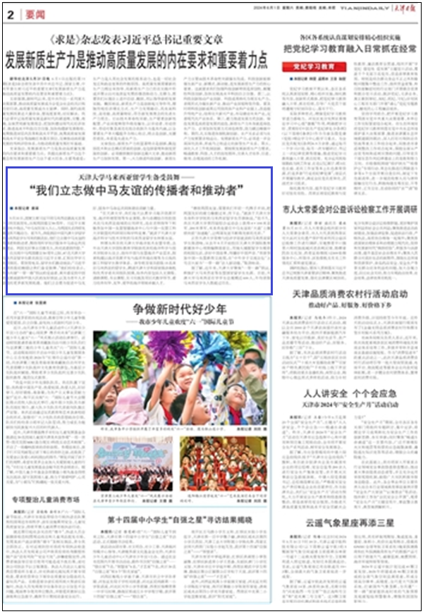 在庆祝中马两国建交50周年之际,87名天津大学马来西亚留学生联名致信习近平主席,汇报在华学习生活情况。看到贺电后,留学生们激动地说:“习近平主席的殷切勉励让我们备受鼓舞。”他们纷纷表示,作为共建“一带一路”倡议的受益者,真实感受到中国的发展成就和中国人民的友好情谊,以及为青年人才创造的更多新发展机遇。他们立志要为促进中马友好、服务中马命运共同体建设贡献力量。