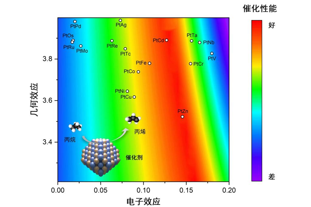 近年来提出的基于“单位点”催化剂的概念实现催化剂电子、几何结构的可控调控与制备,是催化领域长期追求的终极目标。天津大学新能源化工团队提出了“催化微环境预测催化性能”的方法,他们创新算法,借助计算机程序发现了烷烃脱氢“单位点”合金催化剂的设计新途径。基于该方法,研发的新型铂基催化剂贵金属用量降低超60%,可大幅度节约生产成本,提升了催化剂市场竞争力。实验证明,新型催化剂的丙烯选择性显著优于国际同类产品,且在长程稳定性和再生循环测试中均保持稳定。