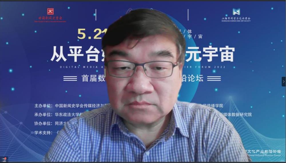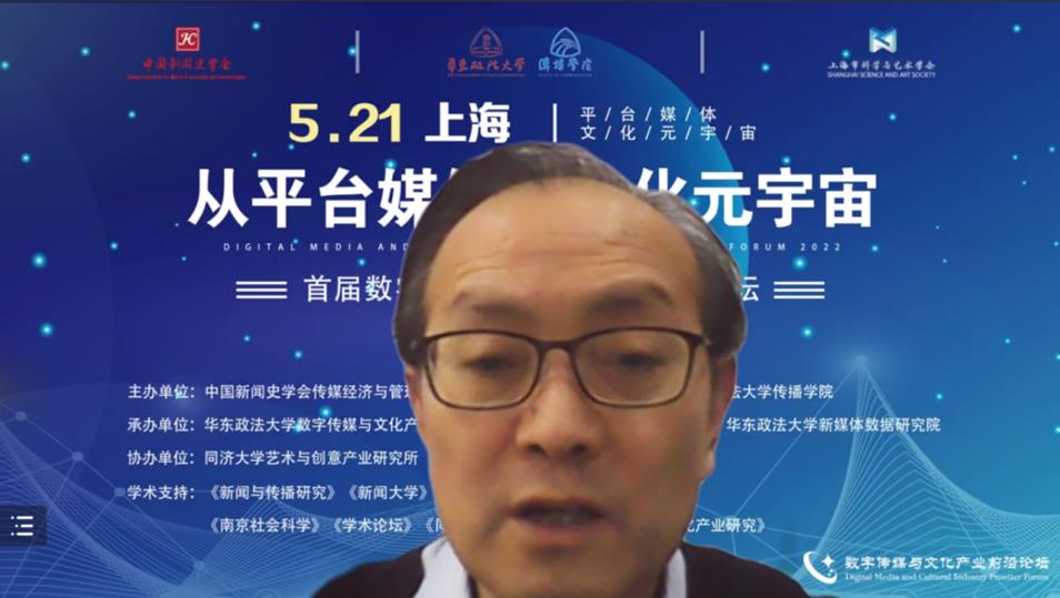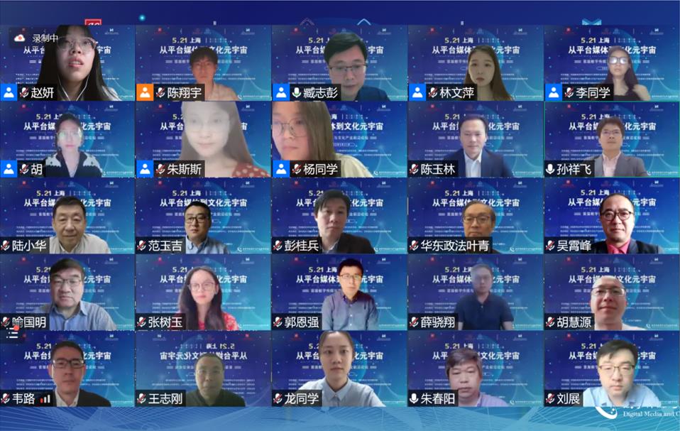 人民网上海5月22日电 (葛俊俊、林文萍、朱斯斯)5月21日,由华东政法大学传播学院联合中国新闻史学会传媒经济与管理专委会、上海市科学与艺术学会主办,以“从平台媒体到文化元宇宙”为主题的首届数字传媒与文化产业前沿论坛(以下简称“前沿论坛”)在线召开。来自清华、北大、北师大、中国社科院、复旦、交大等国内外60多所高校的专家学者以及60余位企业嘉宾就论坛主题进行了深入的研讨。