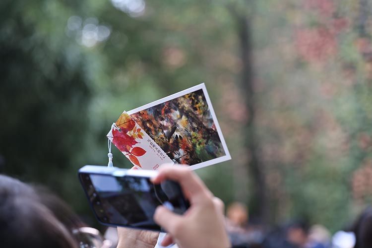 学生拿着红叶明信片拍照打卡