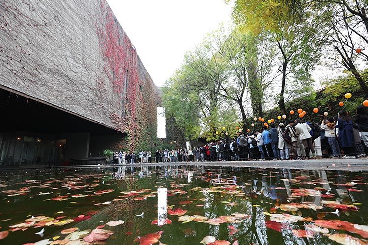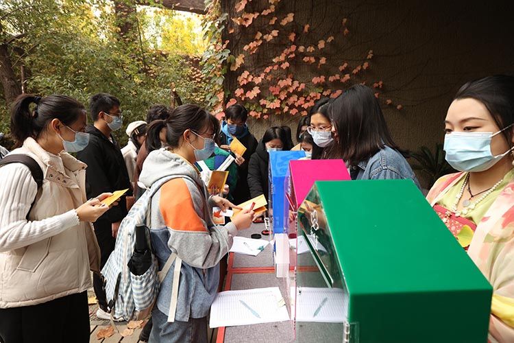 10月29日,天津大学冯骥才文学艺术研究院举办第四届红叶季。同学们朗诵诗歌、演奏音乐、拍照打卡、书写未来信件,在学院的各个角落寻找着秋的诗意和美的惊喜。图为:红叶飘落在澄心池中,红叶、碧水、斑斓锦鲤相映成趣。