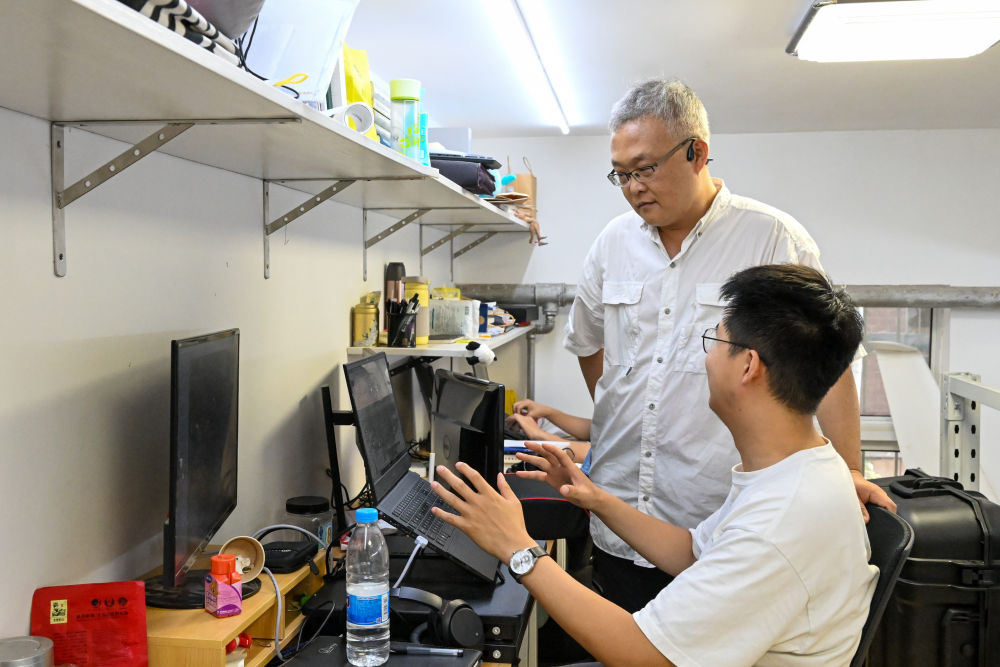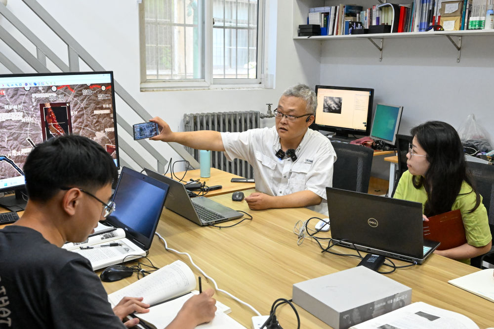 李哲(后)与团队学生在长城研究团队的工作室内交流科研进度(7月25日摄)。