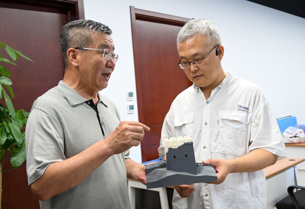 李哲(右)与天津大学长城研究团队负责人张玉坤在办公室内手拿一座3D打印的长城敌楼模型交谈(7月25日摄)。