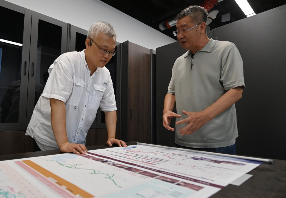 李哲(左)和天津大学长城研究团队负责人张玉坤在办公室内交流(7月25日摄)。