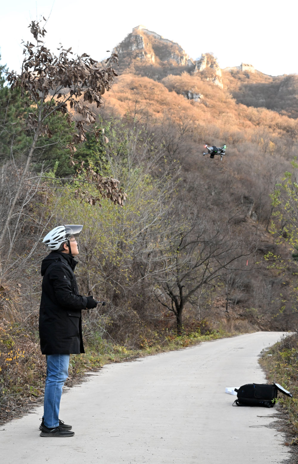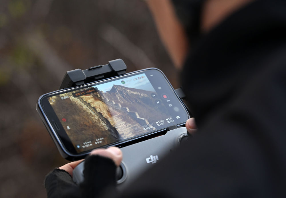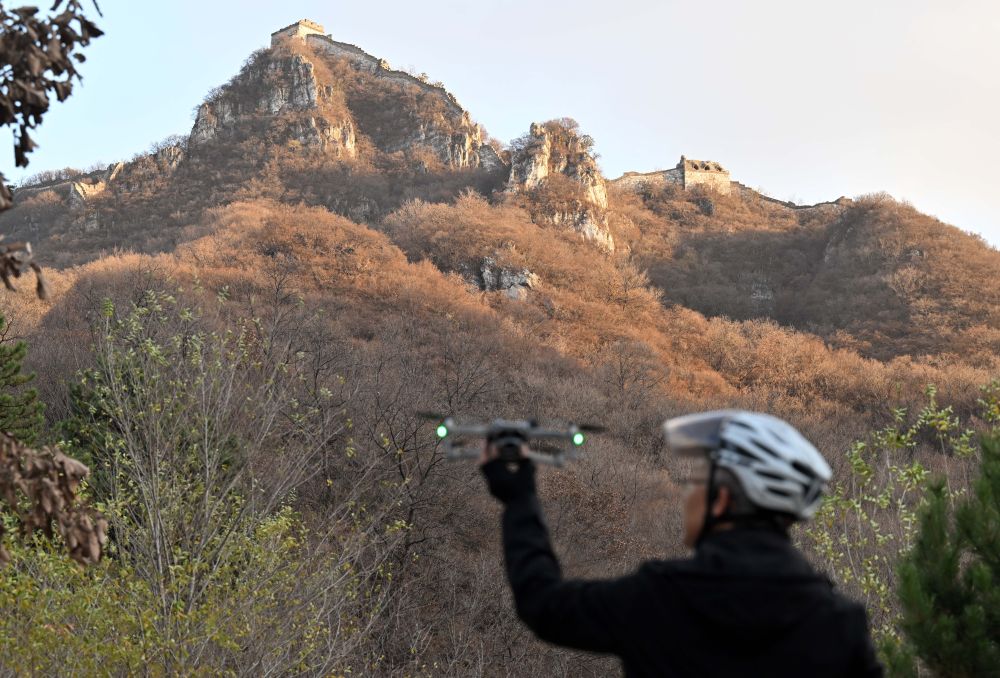 李哲在户外用无人机对北京箭扣长城进行拍摄(11月3日摄)。