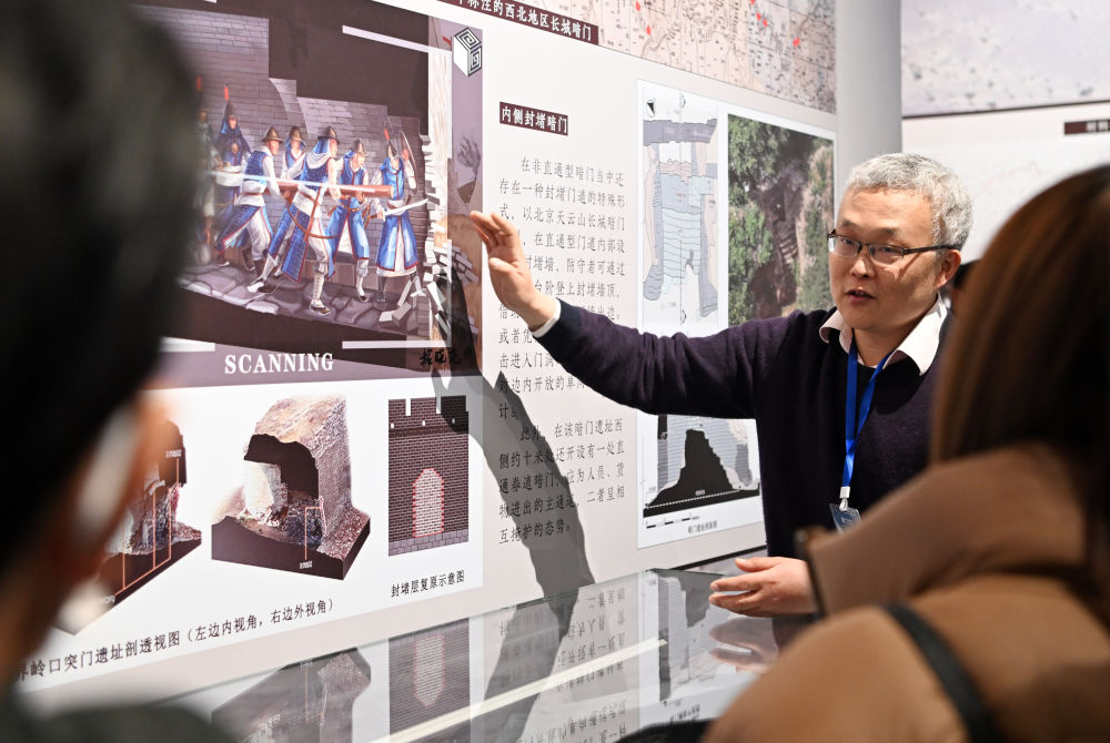 李哲(右二)在“虚实之间·发现长城——天津大学长城研究和数字成果展”上给观众讲解长城突门(2月12日摄)。