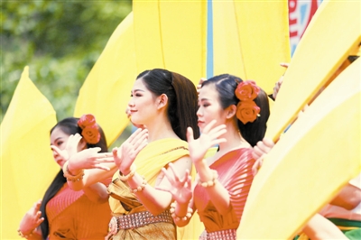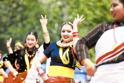 昨天,天津大学“第十二届国际文化节”在北洋广场举行。本届国际文化节包括文艺演出、文化展示和各国美食制作品尝三个部分。现场,留学生们身着不同国家和不同民族的传统服饰,展示来自不同国家的独特风情与文化。国际文化节被誉为天大“小世博”,已在学校连续举办十余年,成为天津大学一年一度的文化盛事。 图为留学生表演不同民族风情舞。