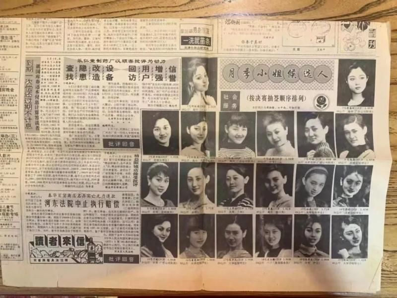 ▲京剧演员张悦(第三排左一),曾在朋友圈晒出当年自己参加月季小姐评选的老报纸,其他参赛选手还有蔡璐、于端、李春玲、刘娟、高原、胡丽英等。