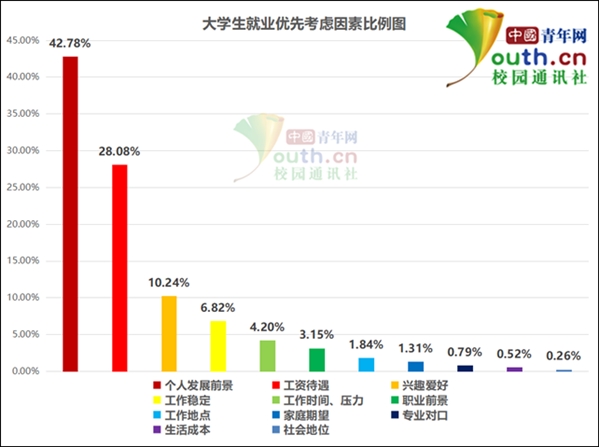 在求职过程中,大学生们最看重哪些因素?调查显示:42.78%的大学生选择“个人发展前景”,28.08%选择“工资待遇”,10.24%选择“兴趣爱好”,6.82%选择“工作稳定”,4.2%选择“工作时间、压力”,1.84%选择“工作地点”。