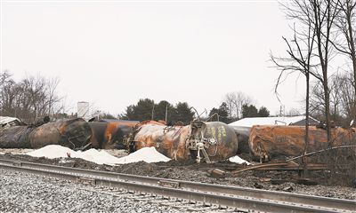 在美国俄亥俄州东巴勒斯坦镇脱轨的列车残骸。新华社发 (章焱飞摄)
