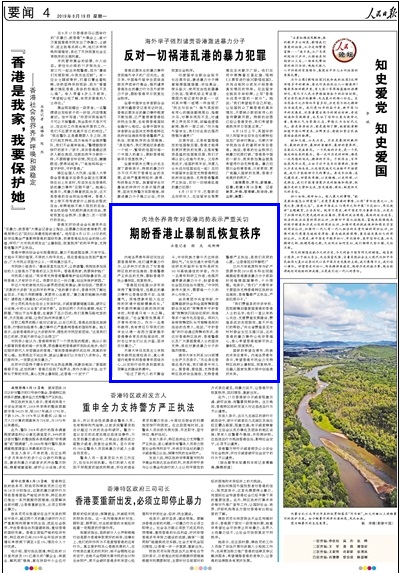 内地各界青年深切关注近期香港局势,他们谴责暴力行为,以多种方式表达了对香港特区政府依法施政、香港警察严正执法的支持,期盼香港尽快止暴制乱,恢复秩序。