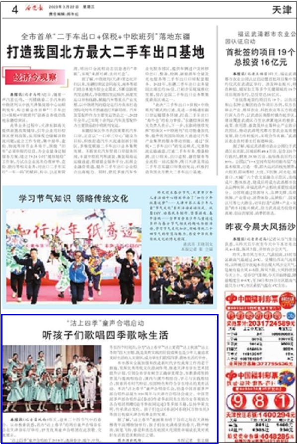 昨天,迎来二十四节气中的春分。从市教委获悉,名为“沽上春早”的两台童声合唱音乐会在天津音乐厅举行,27支优秀童声合唱团在此放歌、交流展示。