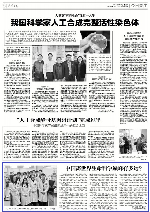 2000年公布的人类基因组测序,中国只承担了百分之一的工作。“这次我们完成了酿酒酵母染色体合成的四分之一,不难看出我们在生命科学研究领域的巨大进步,今后‘领跑’不是不可能。”杨焕明表示。