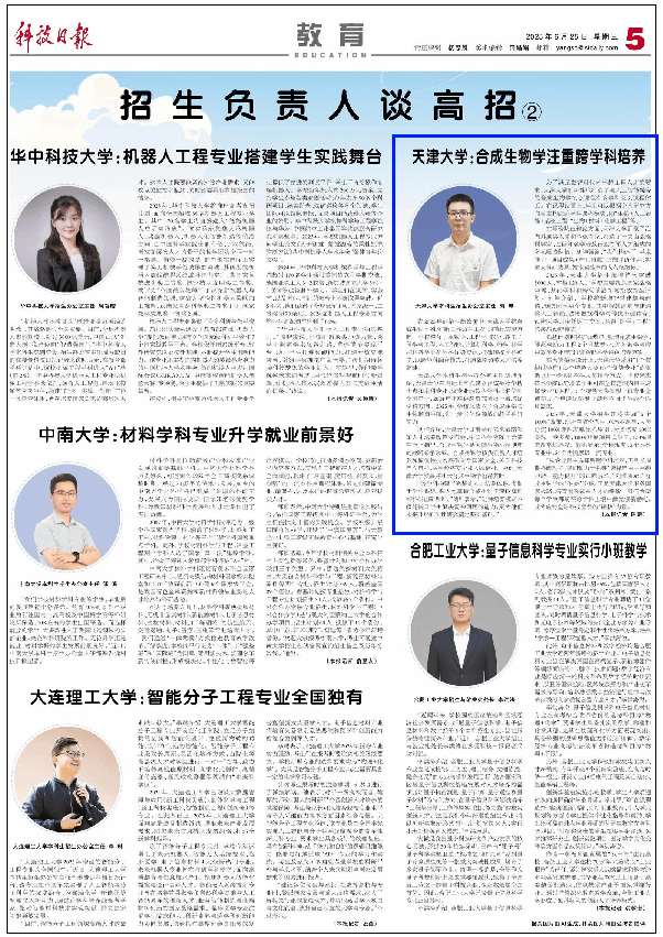 天津大学本科生招生办公室主任刘坤介绍,天津大学在国际上率先建立合成生物学博士点和本科专业,该专业的软科学科排名位列全国第一,2024年还获评教育部首批一流培优学科方向。2025年,学校又成立了合成生物与生物制造学院,进一步强化该领域的教学科研实力。
