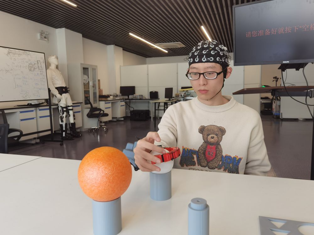 “现在想象,右手腕长出了一根‘第六指’,用它去抓握。”脑机海河实验室团队成员王壮,正在和同事进行“读心术”测试。佩戴机械“第六指”,测试人员右手不断接近桌面,只见机械手指缓缓张开,并稳稳抓住桌子上的小球。