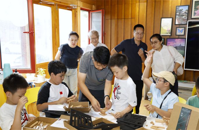 著名建筑学家,天津大学建筑学院王其亨教授指导小朋友们拼斗拱,他说:“北海公园是我国古典园林艺术的杰出代表,自1925年开放以来,始终发挥着重要的文化教育功能。天津大学自上世纪八十年代起就开展北海公园古建筑测绘教学,积累深厚,人才辈出。希望以此次合作为起点,共建教学科研实践基地,推动园林文化课程建设与数字化资源开发,实现‘保护—研究—传播’一体化发展。”