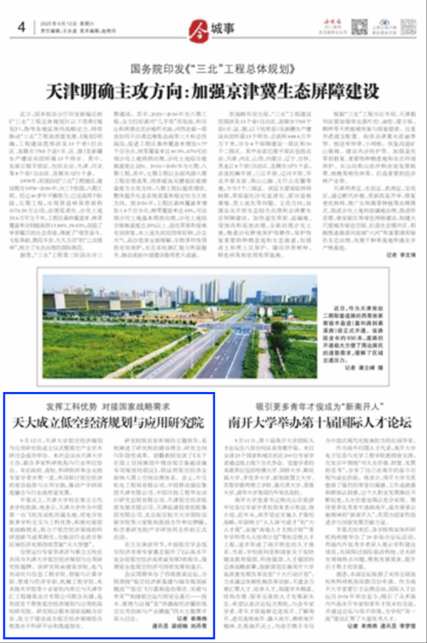 空管运行专家李津济与柴立元校长共同为天津大学低空经济规划与应用研究院揭牌。该研究院由建筑学院、电气自动化与信息工程学院、智能与计算学部、管理与经济学部、机械工程学院、未来技术学院等十余家校内单位与天津华汇工程建筑设计有限公司联合共建,是我国首个聚焦低空经济规划与应用的高校研究院。研究院以服务国家战略为宗旨,致力于建设成为低空经济领域综合性高水平科研平台和高端智库。