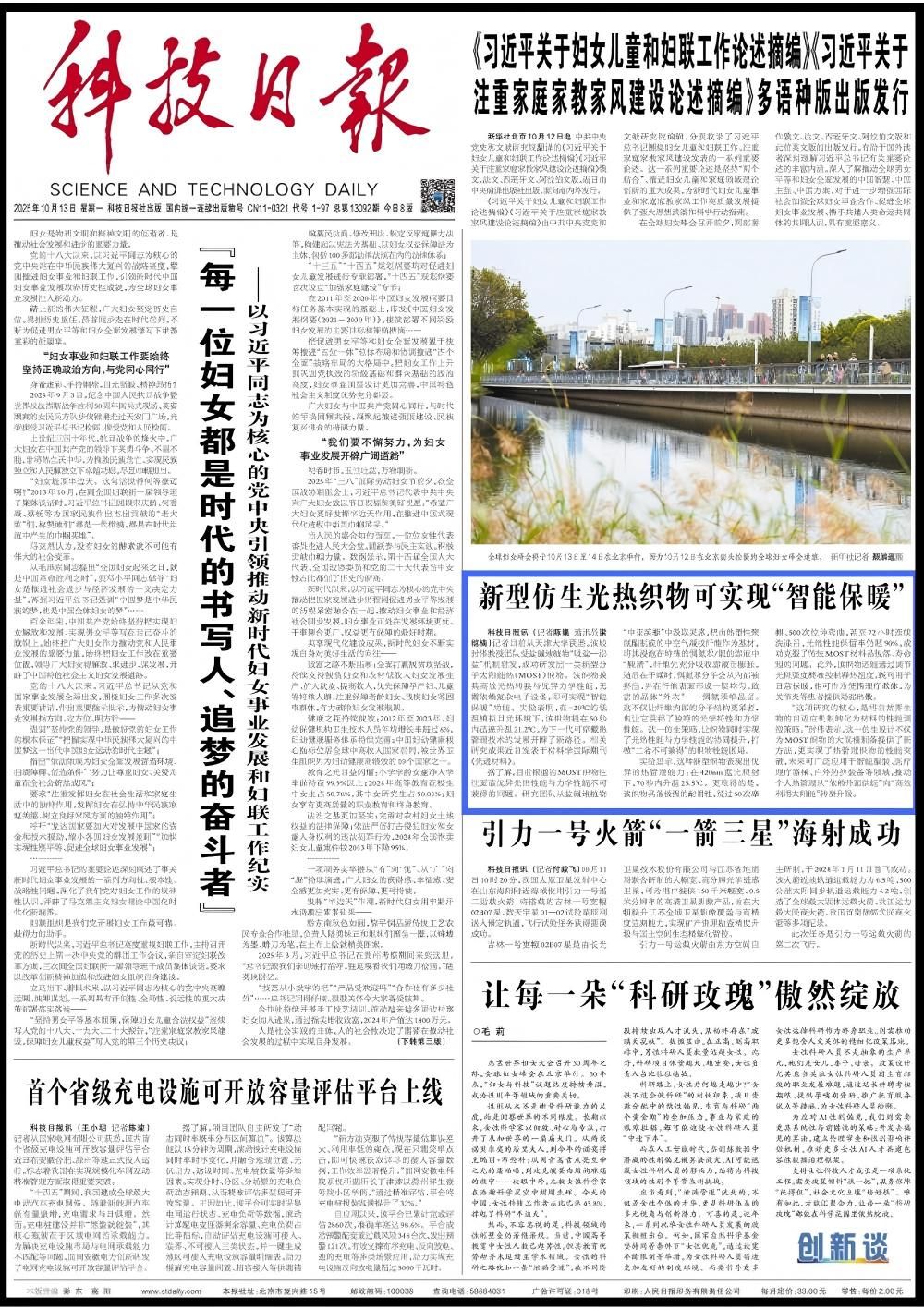 “这项研究的核心,是将自然界生物的自适应机制转化为材料的性能调控策略。”封伟表示,这一仿生设计不仅为MOST织物的大规模制备提供了新方法,更实现了热管理织物的性能突破,未来可广泛应用于智能服装、医疗理疗器械、户外防护装备等领域,推动个人热管理从“依赖外部供能”向“高效利用太阳能”转型升级。