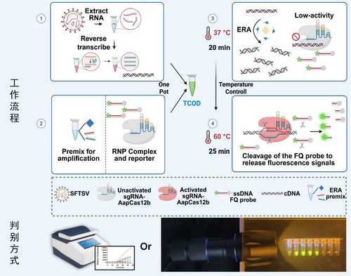该研究把对发热伴血小板减少综合征病毒的扩增与检测“整合”在了一个试管里,通过时序调节温度变化控制检测流程,实现对发热伴血小板减少综合征病毒的灵敏高效识别。利用Cas12b蛋白在低温下酶活受抑的特性,当把温度控制在37℃时,可以让病毒的核酸快速复制扩增,确保检测的超灵敏性;随后把温度调到60℃,激活Cas12b蛋白,完成病毒的识别。通过控制温度变化,实现了检测流程的自动切换,既避免了传统两步法中移液导致的污染风险,又无需额外的化学改造及复杂调控。