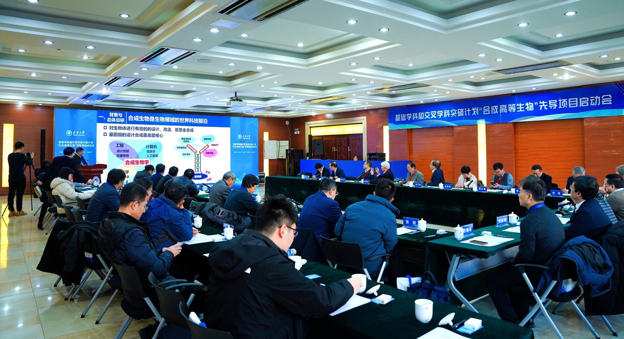 1月8日,由教育部、财政部联合部署的基础学科和交叉学科突破计划“合成高等生物”先导项目启动会在天津大学举行,10名院士和2位专家作为咨询专家组出席会议。