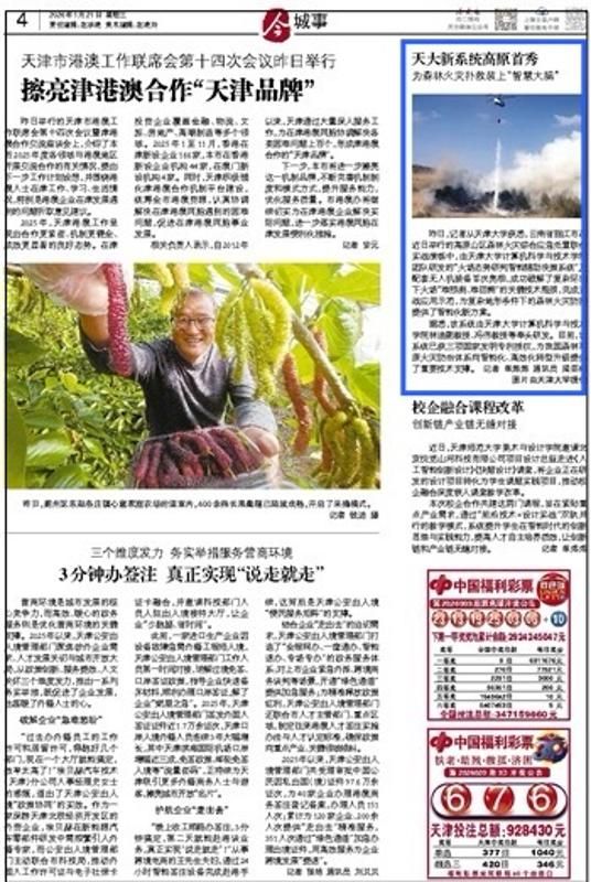 据悉,该系统由天津大学计算机科学与技术学院林迪副教授、冯伟教授等牵头研发。目前,该系统已获三项国家发明专利授权,为我国森林草原火灾防治体系向智能化、高效化转型升级提供了重要技术支撑。记者 单炜炜 通讯员 梁绍楠