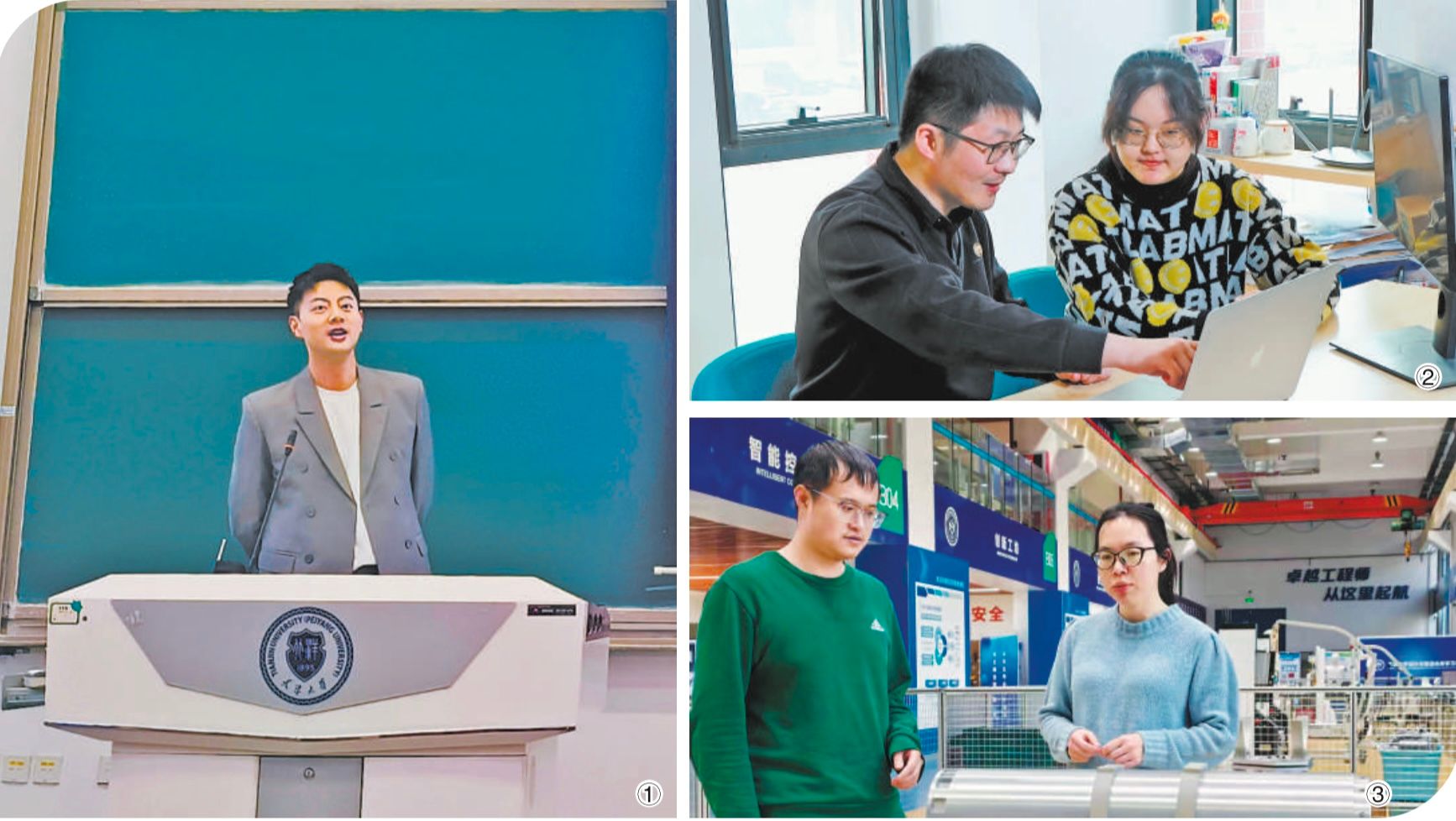 图 ① 天津大学建筑工程学院青年教师邓楚涵正在授课。图 ② 天津大学化工学院青年教师王跃飞(左)正在指导学生。图③ 天津大学机械工程学院青年教师连宾宾 (右) 指导学生做实验。(受访单位供图)