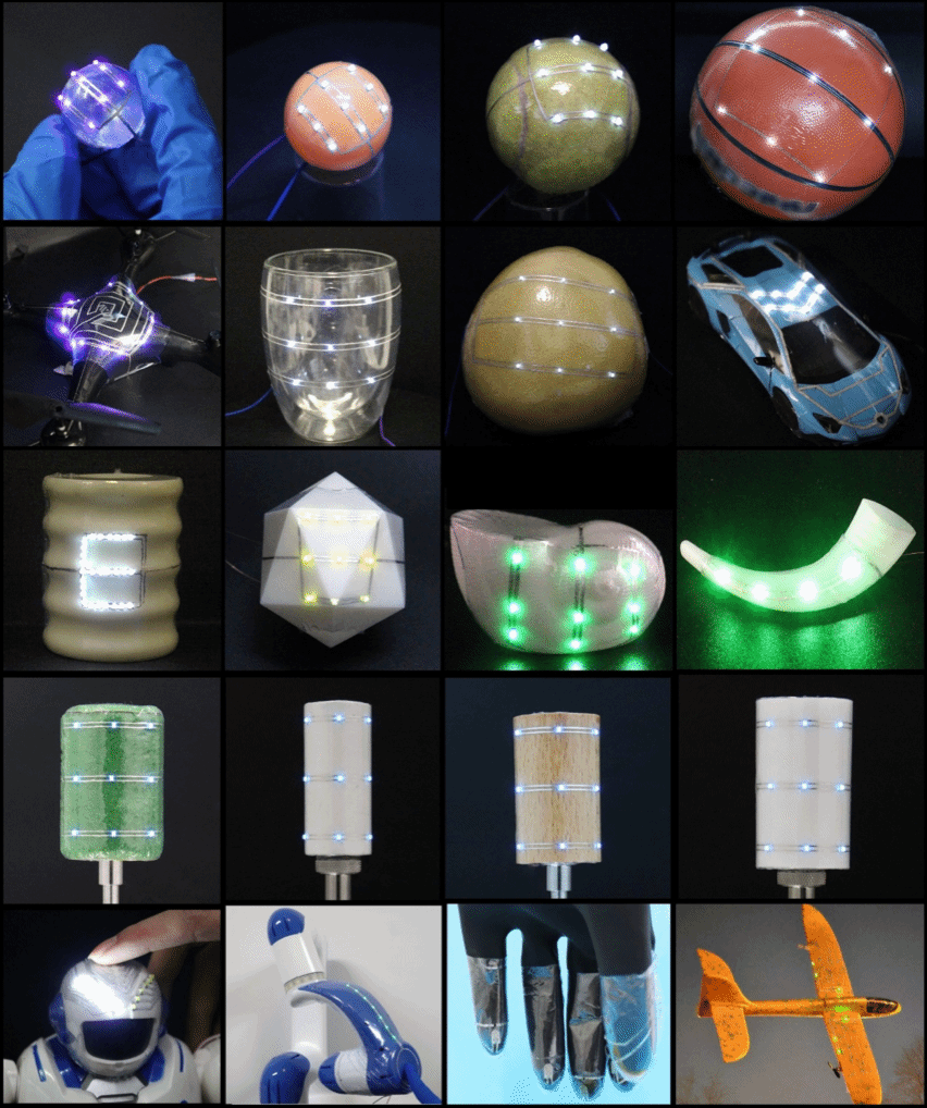 通过该技术,平面电路在约70摄氏度的温水或热风处理后,无论是圆润的苹果、飞机的机翼,还是灵活的手指,都能按照预先设计的“变形蓝图”快速自适应贴合。
